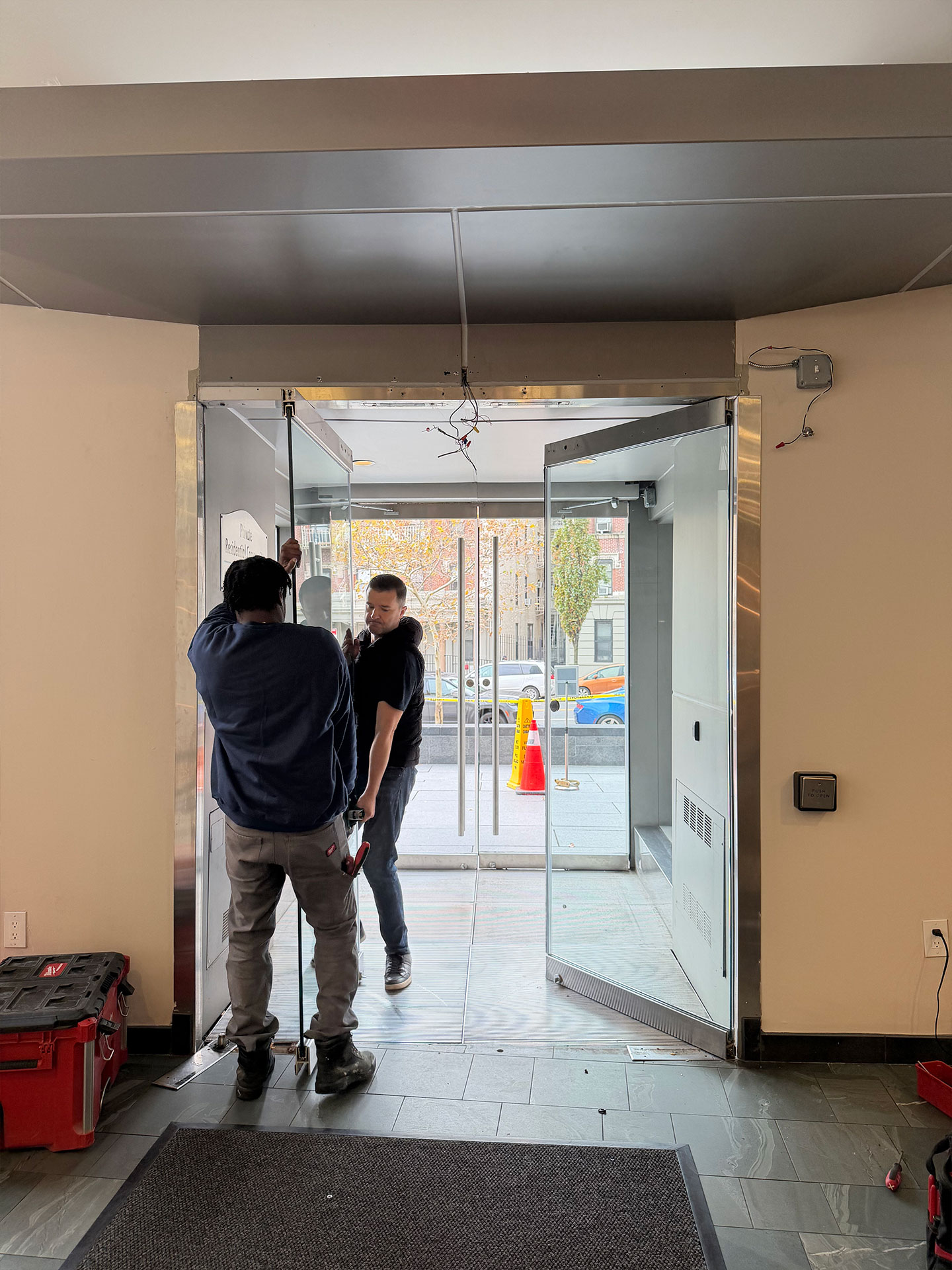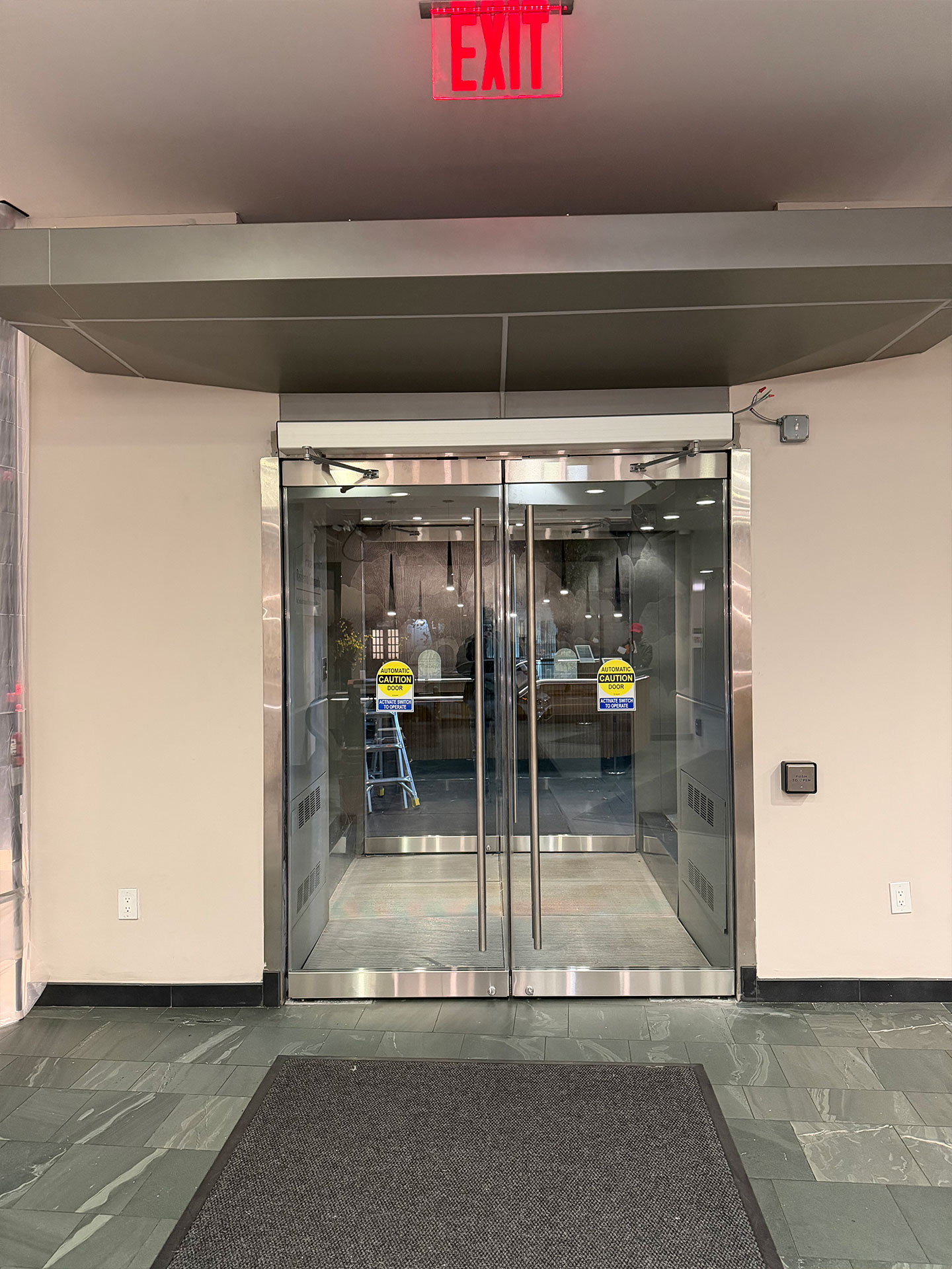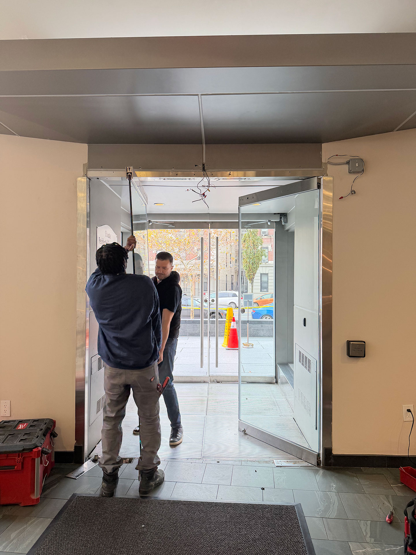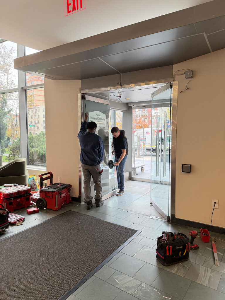 After the installation of the new door systems, our technicians proceeded to automate the entire entrance. We mounted and wired automatic door operators above both double-door units, transforming them into fully accessible, hands-free entryways. The operators were precisely calibrated to provide smooth, quiet, and reliable operation, while meeting current New York accessibility standards.