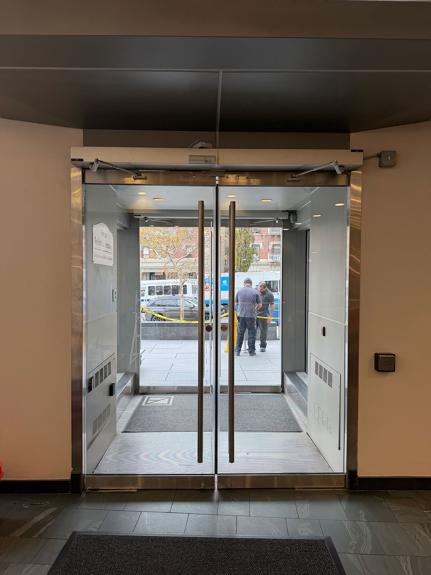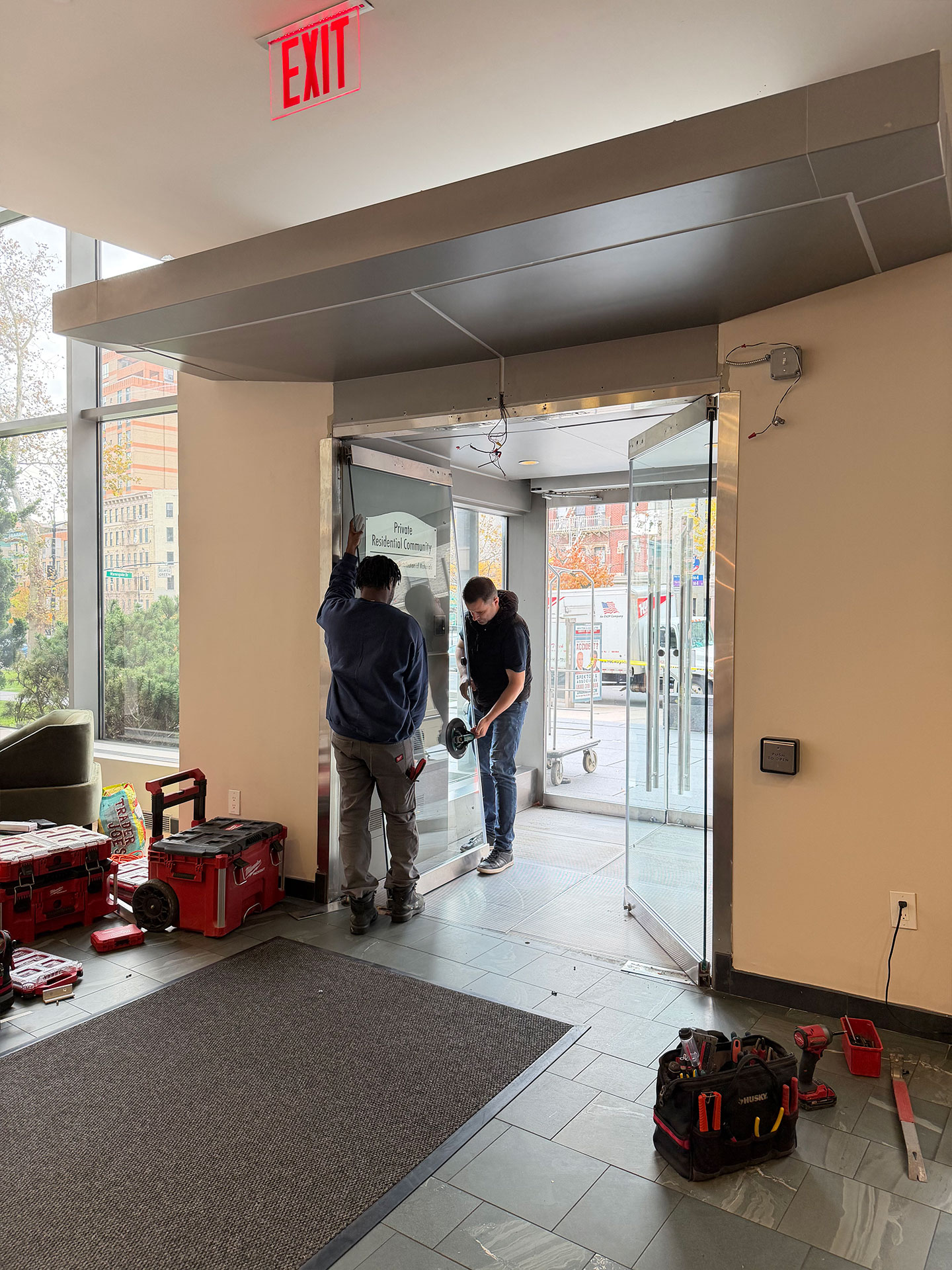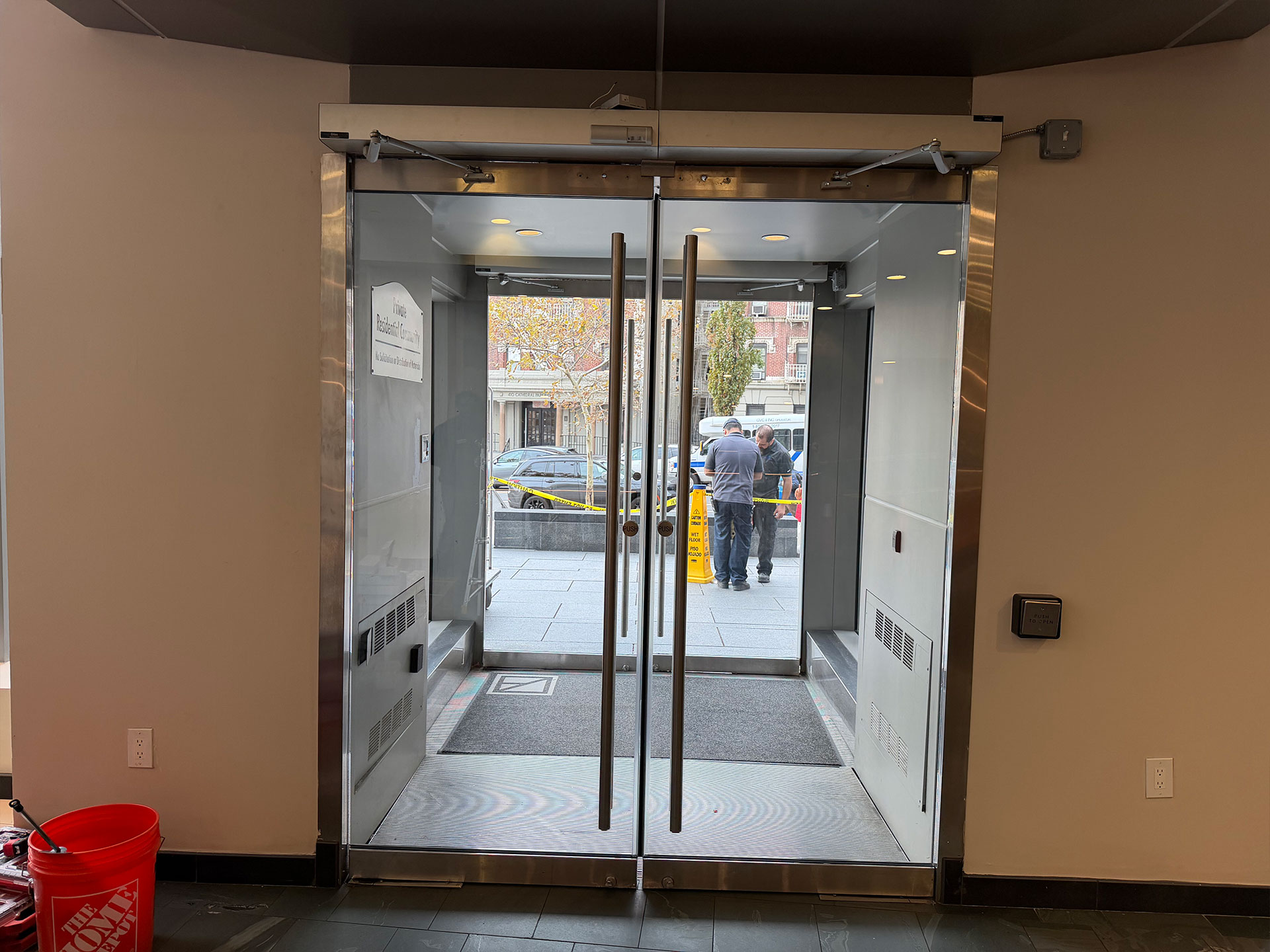 After the installation of the new door systems, our technicians proceeded to automate the entire entrance. We mounted and wired automatic door operators above both double-door units, transforming them into fully accessible, hands-free entryways. The operators were precisely calibrated to provide smooth, quiet, and reliable operation, while meeting current New York accessibility standards.